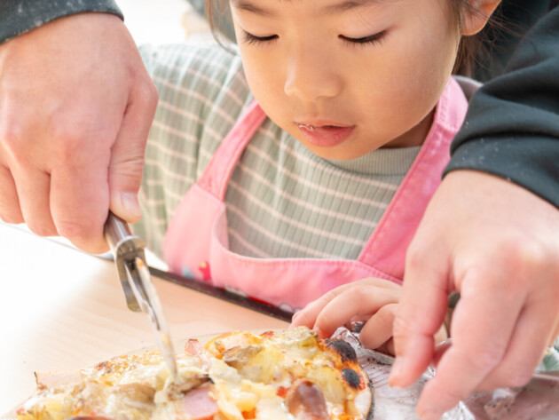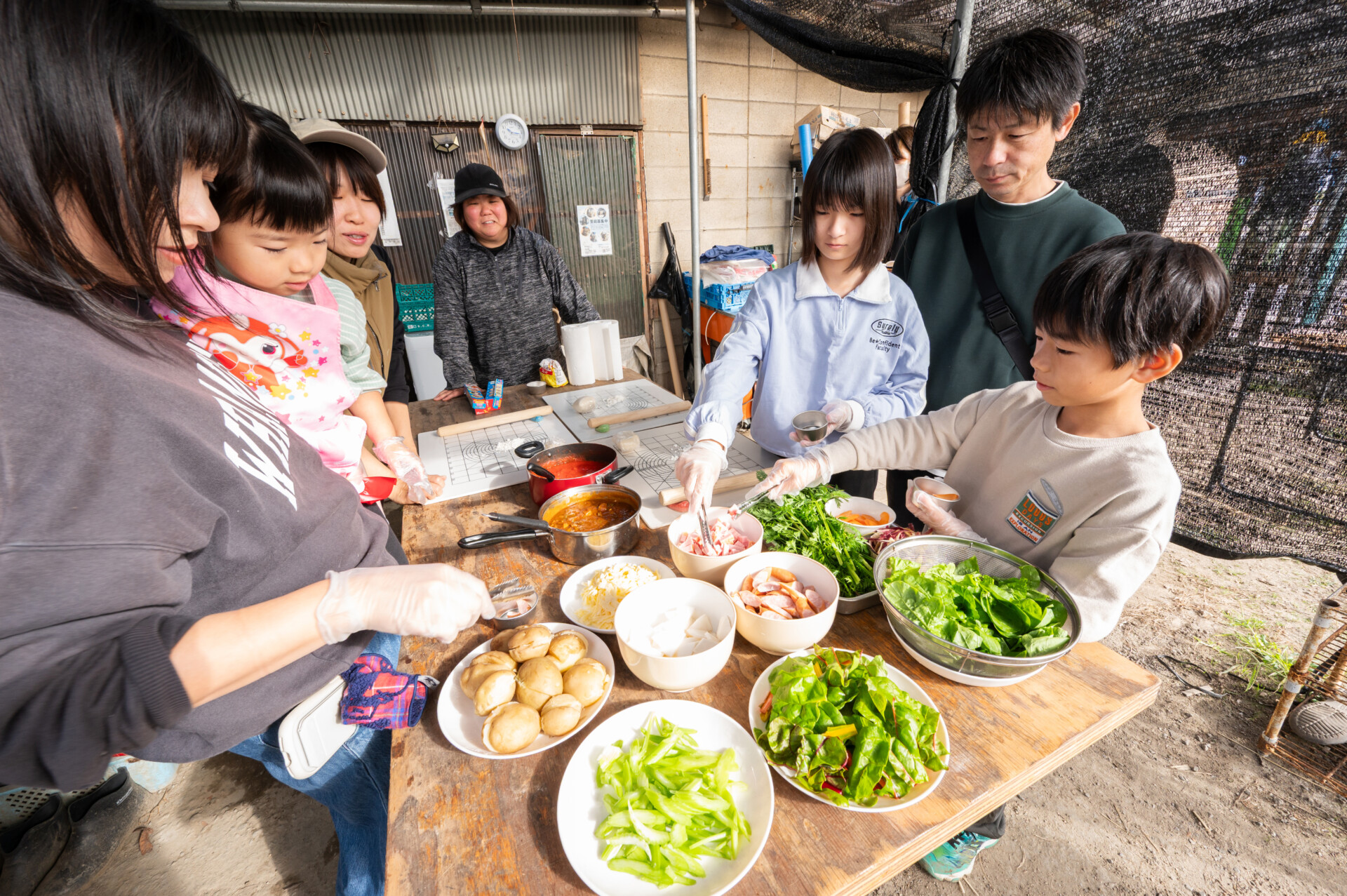 収穫を終えた参加者は、ピザ作りを体験。管理栄養士の資格を持つ長重さんの指導の下、生地に自家製ソースをぬって、とりたての野菜をたっぷりのせていきます。子どもから大人まで、みなさんとても楽しそうです。